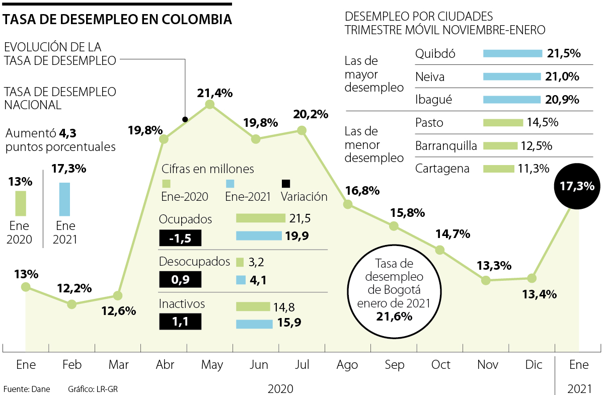 A pesar de que la tasa de desempleo venía recuperándose desde que tocó máximos en mayo de 2020 (21,4%), el Departamento Administrativo Nacional de Estadística (Dane) informó que en enero se ubicó en 17,3%. Ello representa un deterioro de 4,3 puntos porcentuales frente a la cifra del mismo periodo de 2020 (13%) y de 3,9 puntos frente a diciembre (13,4%). Así, en los últimos 12 meses se quedaron sin trabajo 951.000 personas puesto que el número de desempleados subió de 3,2 millones a 4,1 millones.