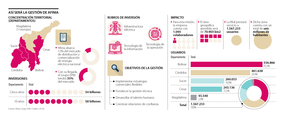 La operación de ese segmento es la prioridad principal de Afinia, filial del Grupo EPM, que desde el pasado 1 de octubre se ha encargado de lograr el objetivo trazado por el presidente Iván Duque tras el anuncio de esta operación: brindar una solución estructural definitiva para dejar atrás los problemas que han tenido los departamentos de la región Caribe y consolidar la prestación del servicio de energía en la zona, que cuenta con un total de 1.084 colaboradores que atenderán un área geográfica de 70.903 km2.