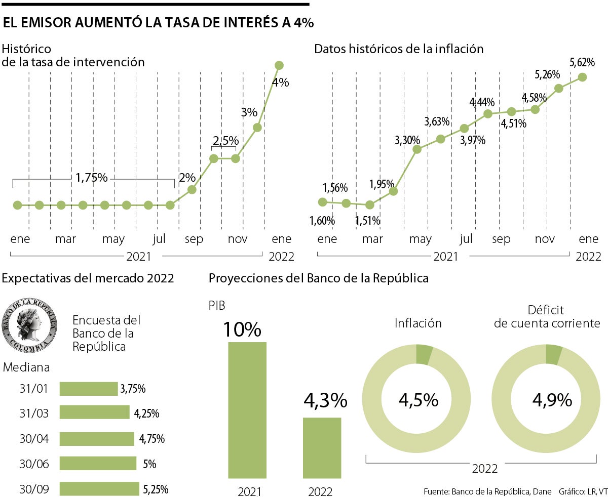 En su primera reunión de este año, la Junta Directiva del Banco de la República decidió, por mayoría, aumentar la tasa de interés de referencia en 100 puntos básicos, con lo que quedó en 4%, su mayor nivel desde marzo de 2020.
