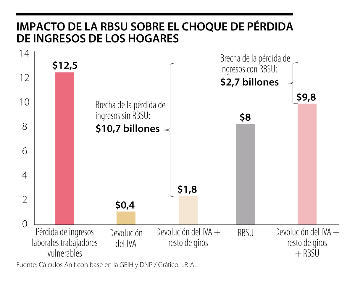 De acuerdo con las estimaciones de la entidad, esta inversión valdría $8 billones, y teniendo en cuenta que la pérdida laboral a mayo será de $12,5 billones y que las medidas como la devolución del IVA y los subsidios del Ingreso Solidario, que ya puso en práctica el Gobierno valen $1,8 billones; la brecha entre lo que se pierde y el Gobierno daría sería menor.