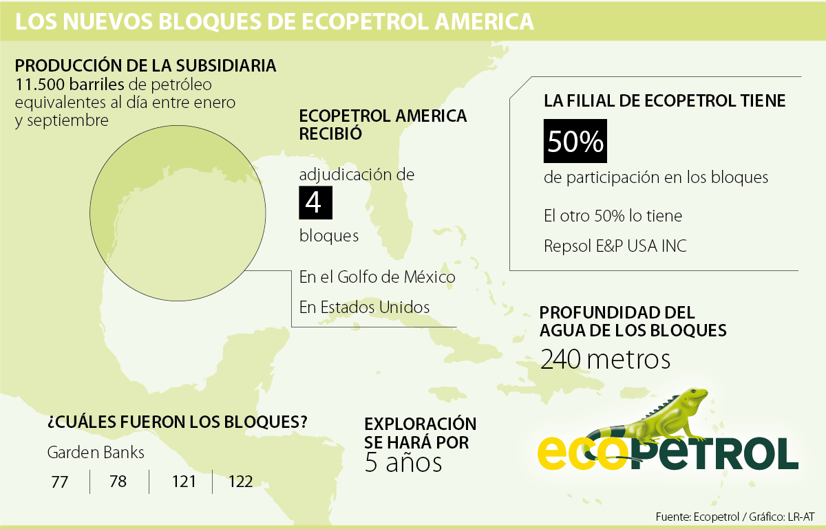 Dentro de esta nueva estrategia, la compañía ha logrado ampliar su portafolio fuera del país, como es el caso de Ecopetrol America, que ganó la adjudicación de cuatro nuevos bloques en el Golfo de México en Estados Unidos, por parte de Bureau of Ocean Energy Management (Boem), donde esta subsidiaria tiene 50% de participación. El otro 50% lo tiene Repsol, que además es el operador de estos nuevos bloques.