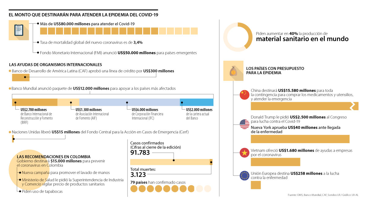 La intensa expansión del Covid-19 en gran parte del mundo tiene en alerta ya no solo a las autoridades sanitarias, sino también a los organismos económicos multilaterales. Con más de 91.800 casos confirmados y alrededor de 3.200 muertes, ya se han anunciado un poco más de US$80.000 millones para atender la epidemia, que ya se expande por América Latina y la cual podría afectar los pronósticos de crecimiento para este año.