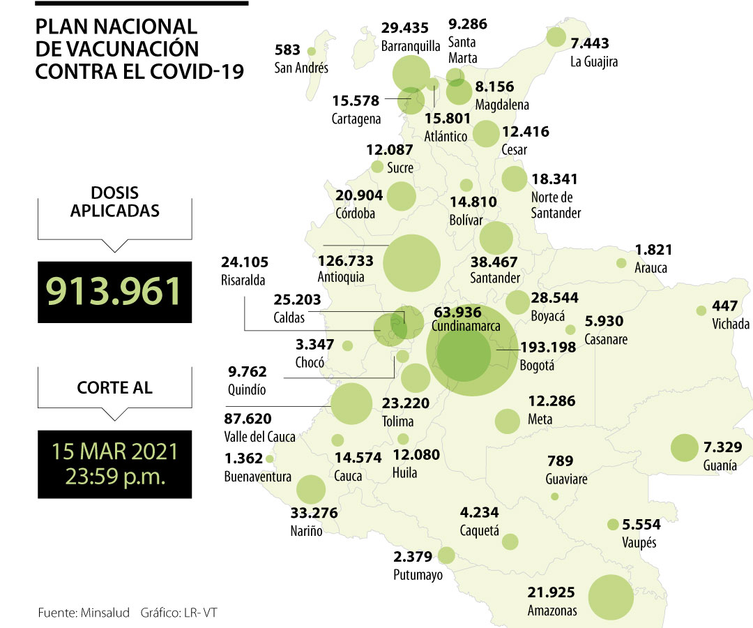 Con ello, a partir del 17 de febrero se iniciaron los procesos de inoculación de la vacuna, primordialmente, a los trabajadores de la primera línea de la salud y a los mayores de 80 años. A corte del 15 de marzo, el Ministerio de Salud informó que, en total, se han aplicado 913.961 dosis, por lo que de seguir con esta tendencia entre hoy (si la aplicación diaria sobrepasa 86.000) o mañana se podrían alcanzar el millón.