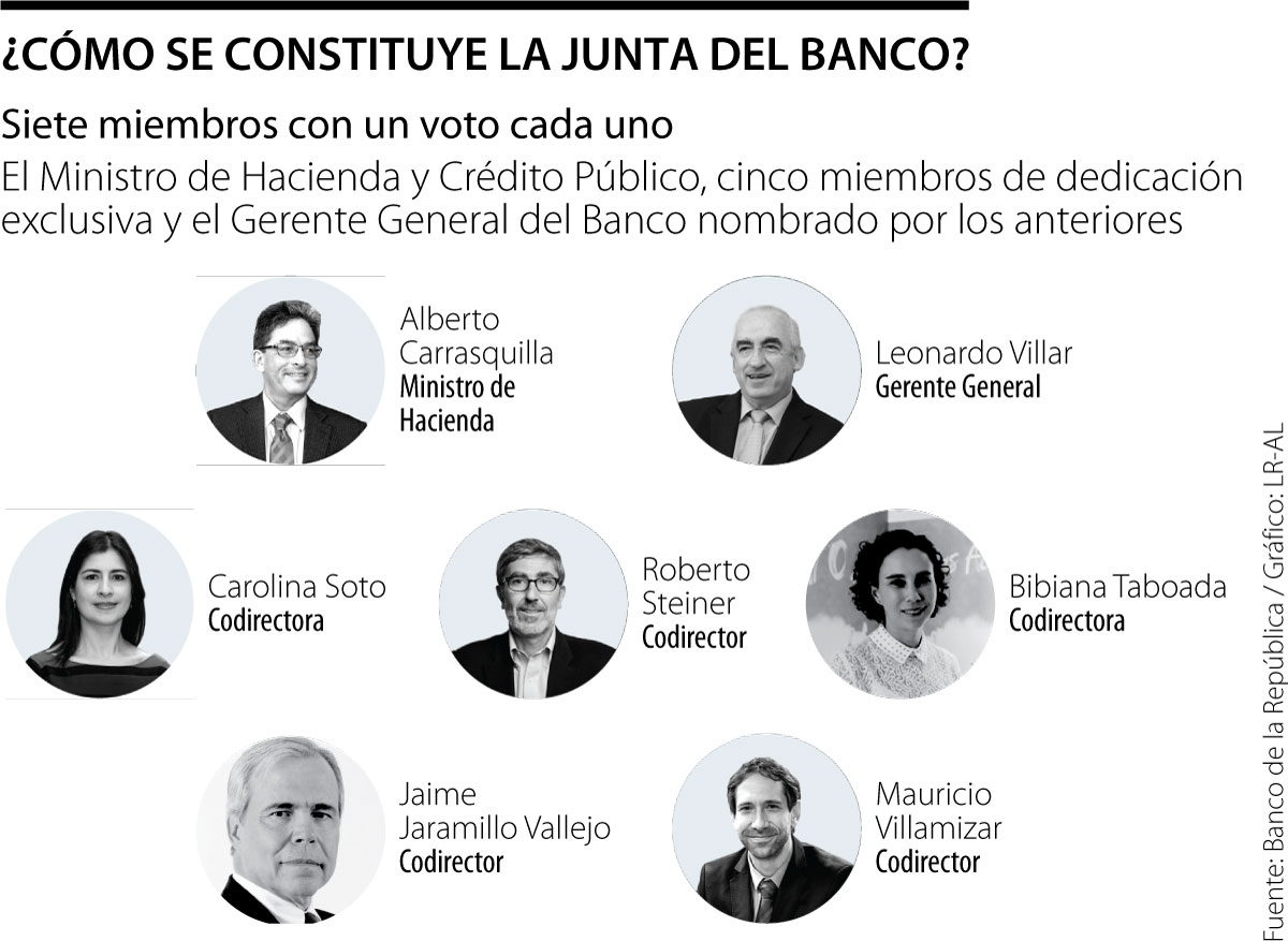 Con el cambio anunciado ayer por el presidente, la Junta Directiva quedó conformada por los siguientes siete integrantes: el gerente general, Leonardo Villar; el ministro de Hacienda, Alberto Carrasquilla; y cinco codirectores, Carolina Soto, Roberto Steiner, Mauricio Villamizar, Bibiana Taboada y Jaime Jaramillo.