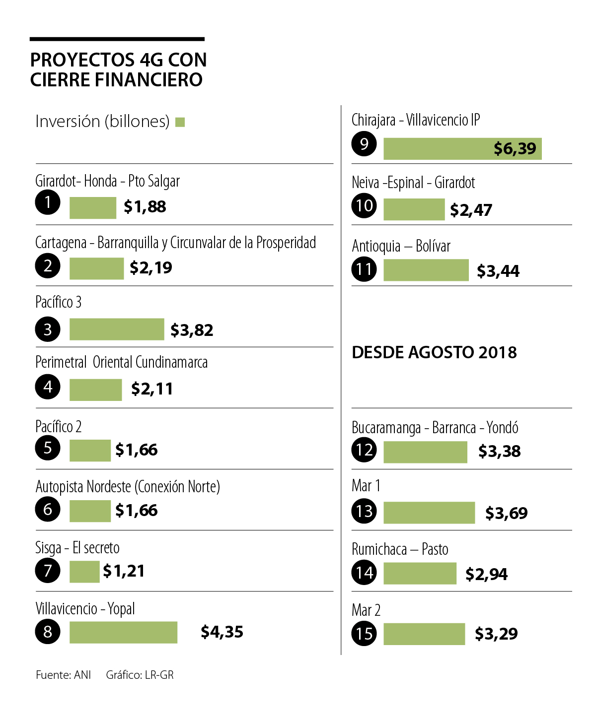 La mitad de las carreteras que hacen parte del programa de Cuarta Generación (4G) ya tienen garantizados los recursos para la finalización de sus obras. Tras el anuncio del Ministerio de Transporte en China sobre la firma de un contrato de crédito por US$652 millones de la Autopista al Mar 2, el Gobierno Nacional confirmó que ya son 15 proyectos, de las 29 iniciativas existentes, los que ya tienen asegurado los cierres financieros.