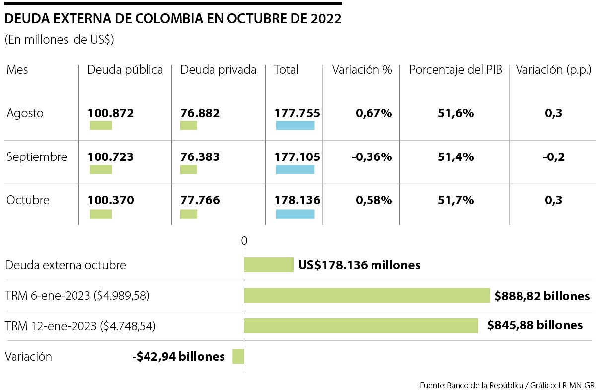 De acuerdo con cifras recientes del Banco de la República, el endeudamiento externo de Colombia alcanzó un nuevo máximo histórico en octubre de 2022 hasta los US$178.136 millones, lo que significa un 51,7% del Producto Interno Bruto.