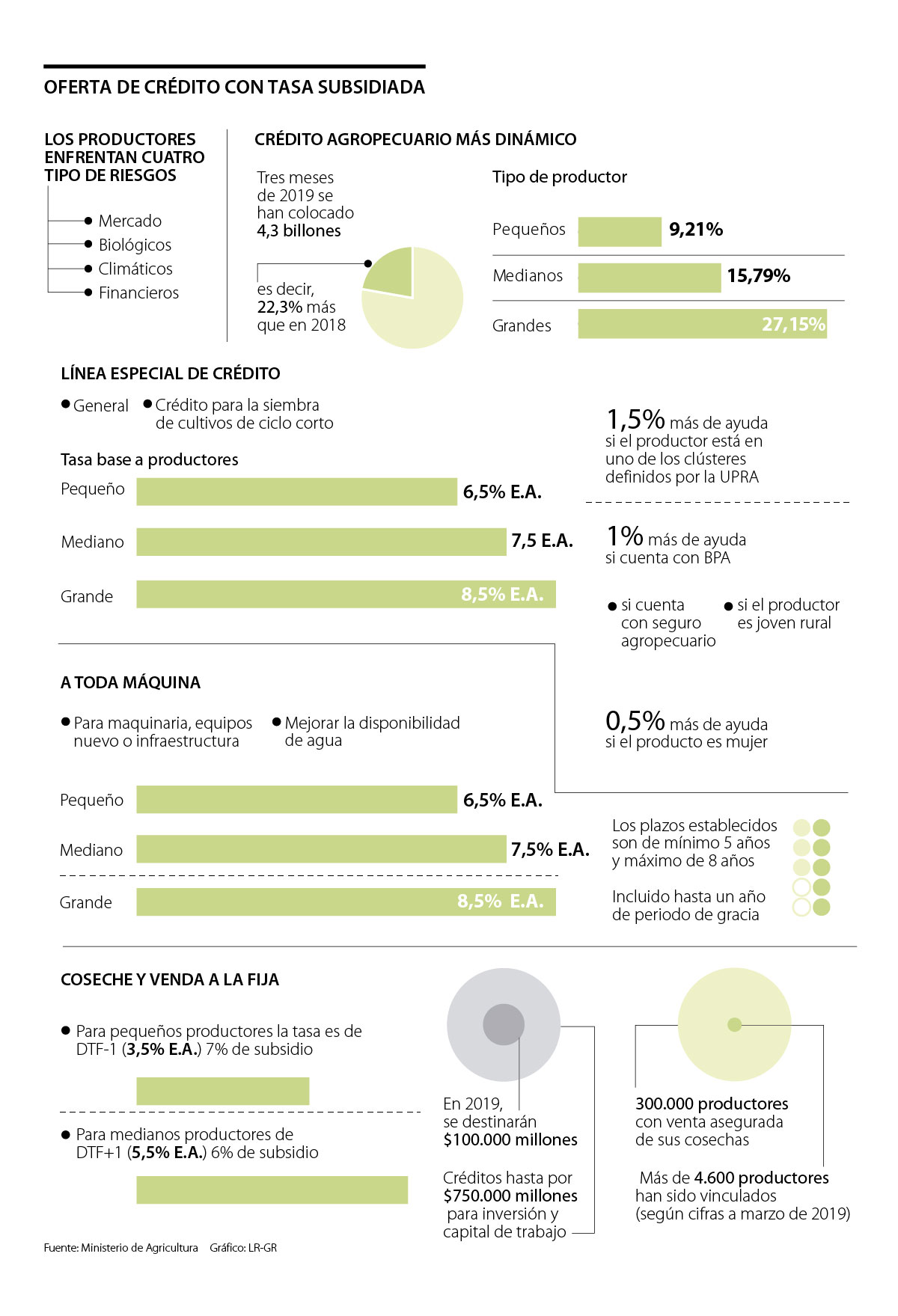 Estas tres líneas han hecho que el acceso a crédito sea más llamativo para los pequeños productores. La colocación de crédito ha tenido un crecimiento y dinámica importante. En los primeros tres meses de 2019 se colocaron $4,3 billones, es decir, 22,3% más que en el mismo periodo de 2018, cuando la cifra totalizó $3,4 billones. Los pequeños (9,21%), medianos (15,79%) y grandes productores (27,15%) también han tenido un crecimiento importante en la demanda de recursos, con crecimientos entre 9,21% y 27,15%.