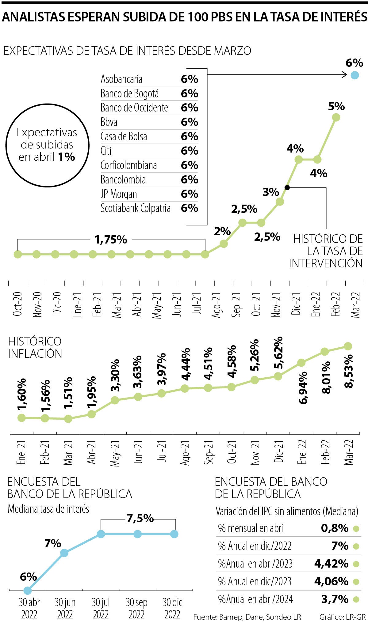 Cabe recordar que para marzo el mercado esperaba una subida más agresiva en la tasa que frenara no solo la inflación sino también las expectativas que han venido al alza. No obstante, el Emisor consideró que esta medida podía tener consecuencias en el crecimiento de la economía, con lo que su decisión fue considerada expansionista. Por esto, muchos ya no esperan que la decisión sea tan fuerte.