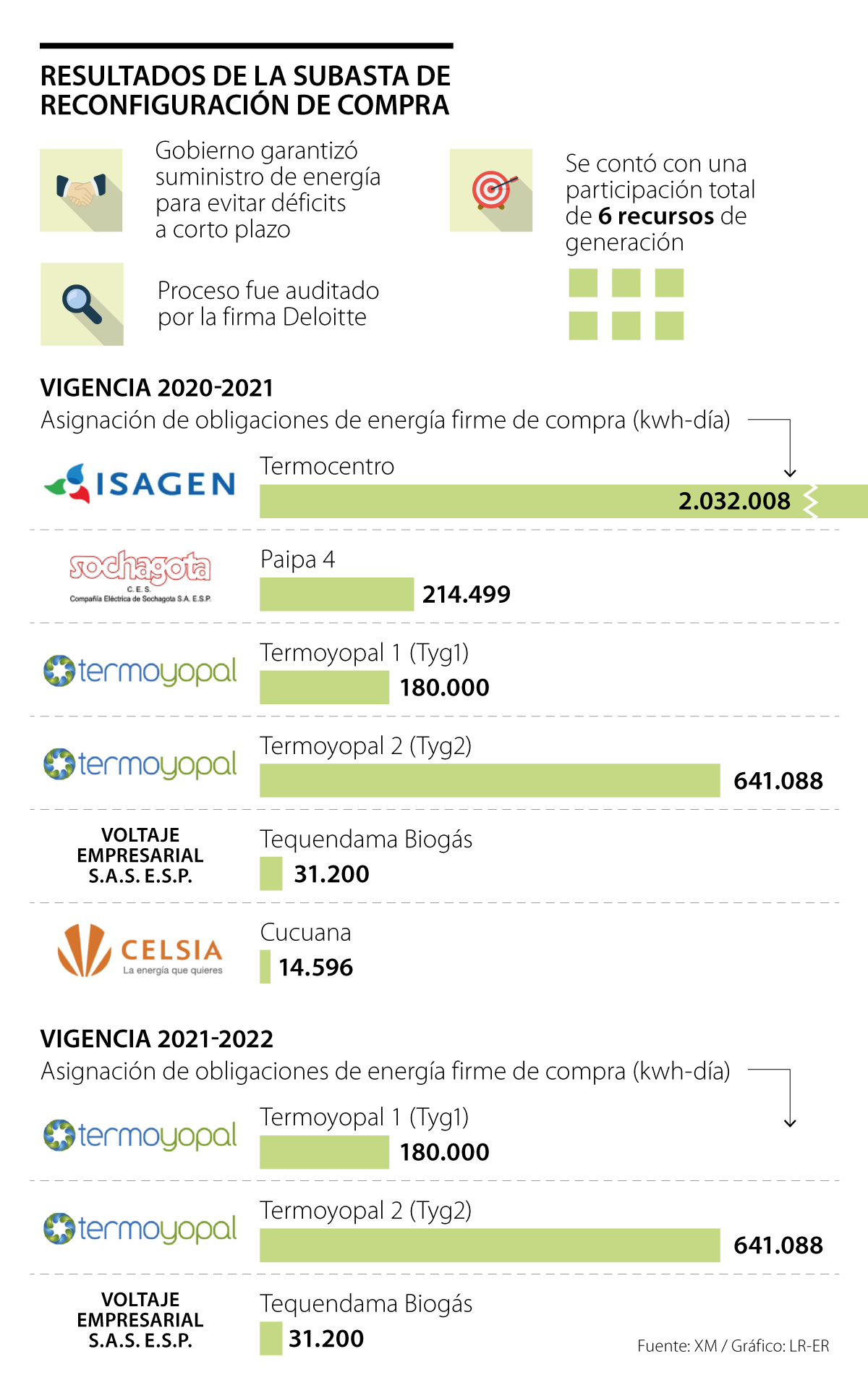 El proceso, que fue auditado por la firma Deloitte, contó con una participación total de seis recursos de generación, a los cuales se les asignó la totalidad de la energía ofertada. En las dos subastas, la participación de las plantas térmicas fue significativa, ya que se le asignaron más de 95% de la energía que preveía el Gobierno.