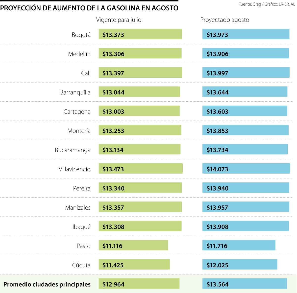 Si el incremento es de $600, como los dos últimos ajustes de junio y julio, el precio promedio del galón en las ciudades principales llegaría a $13.564 para agosto.