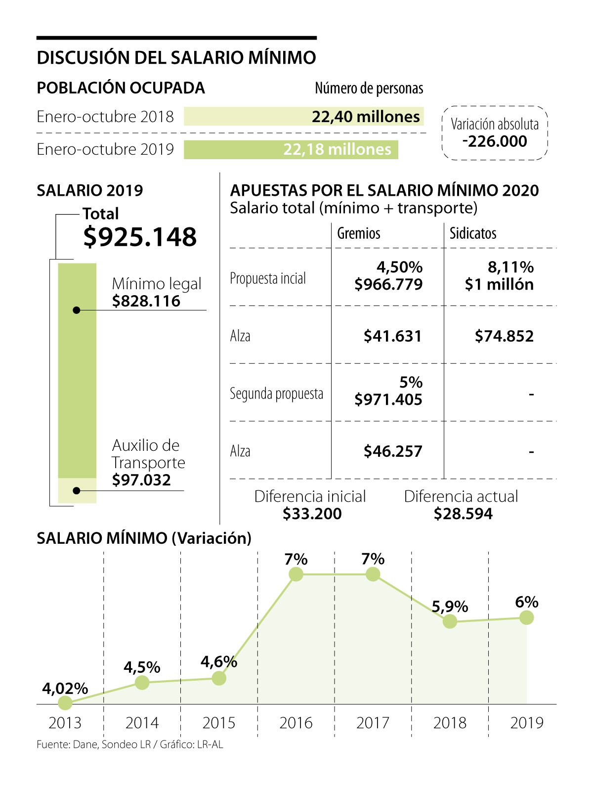 Hace una semana, los empresarios cedieron en 0,5 puntos adicionales su oferta de 4,5%, por lo que llegan al debate de hoy con una oferta de un alza de 5% para el salario mínimo y el subsidio de transporte. Esto representaría un incremento de $46.257, por lo que el salario total quedaría como mínimo en $971.405.