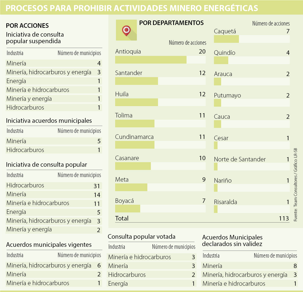 Ya son 113 las consultas populares y los acuerdos municipales que se han puesto en marcha con el objetivo de prohibir proyectos del sector minero energético. Algunas de estas consultas ya han sido votadas, mientras que las iniciativa de otras han sido suspendidas. Así mismo, hay acuerdos municipales vigentes como otros que han sido declarados sin validez.
