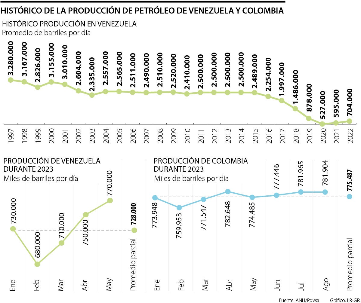 Hoy Colombia, según la Agencia Nacional de Hidrocarburos produce más de 781.904 barriles de petróleo por día, fecha del último registro con corte hasta agosto. Mientras que Venezuela, su último dato oficial corresponde a 770.000 barriles al día. La producción colombiana ha mantenido un promedio de 775.487 barriles, y la venezolana 728.000, aunque analistas creen que el país vecino está más cerca de superar los 800.000, luego de la flexibilización de sanciones de Estados Unidos a Pdvsa.