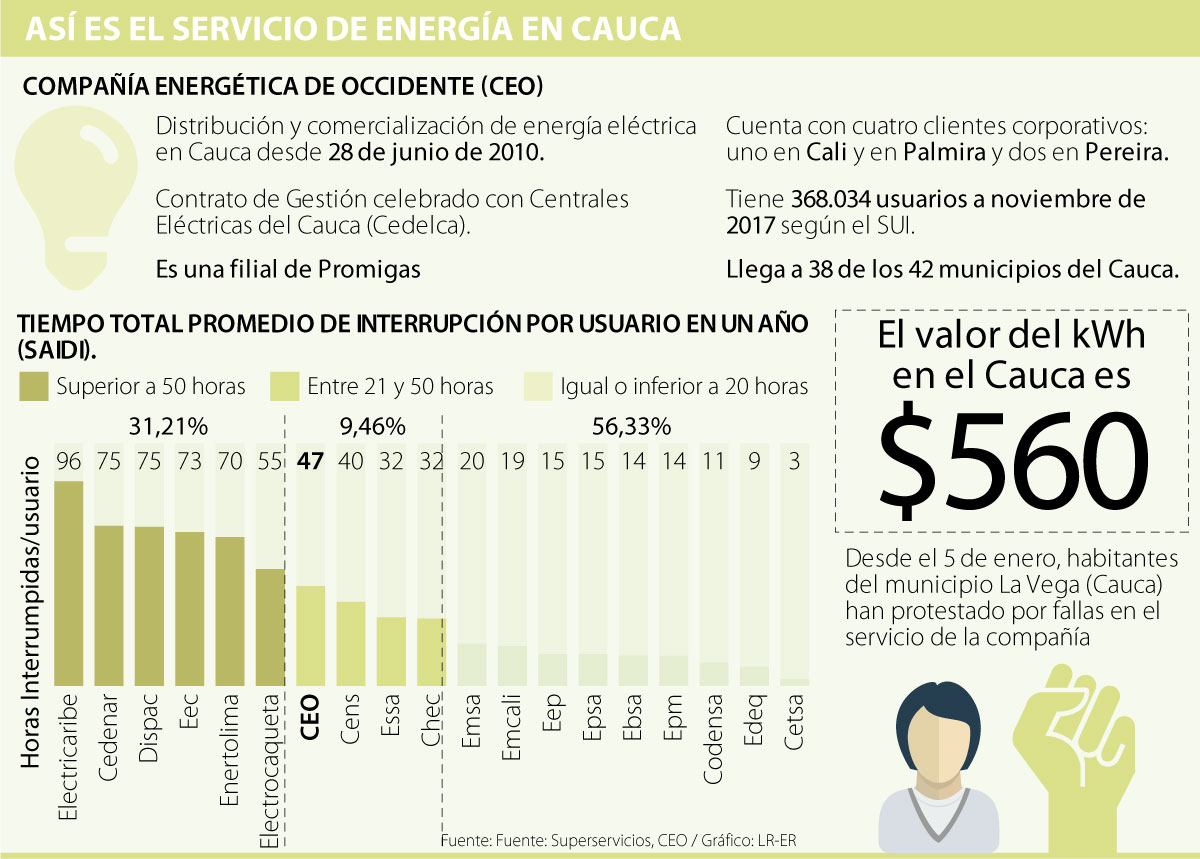 CEO, compañía de Promigas, tiene el contrato para invertir, administrar, operar y mantener el sistema eléctrico de ese departamento desde el 28 de junio de 2010 cuando firmó el contrato con Cedelca (Centrales Eléctricas del Cauca). A noviembre del año pasado había 368.034 usuarios según el Sistema Único de Información (SIU) de la Superintendencia de Servicios Públicos.