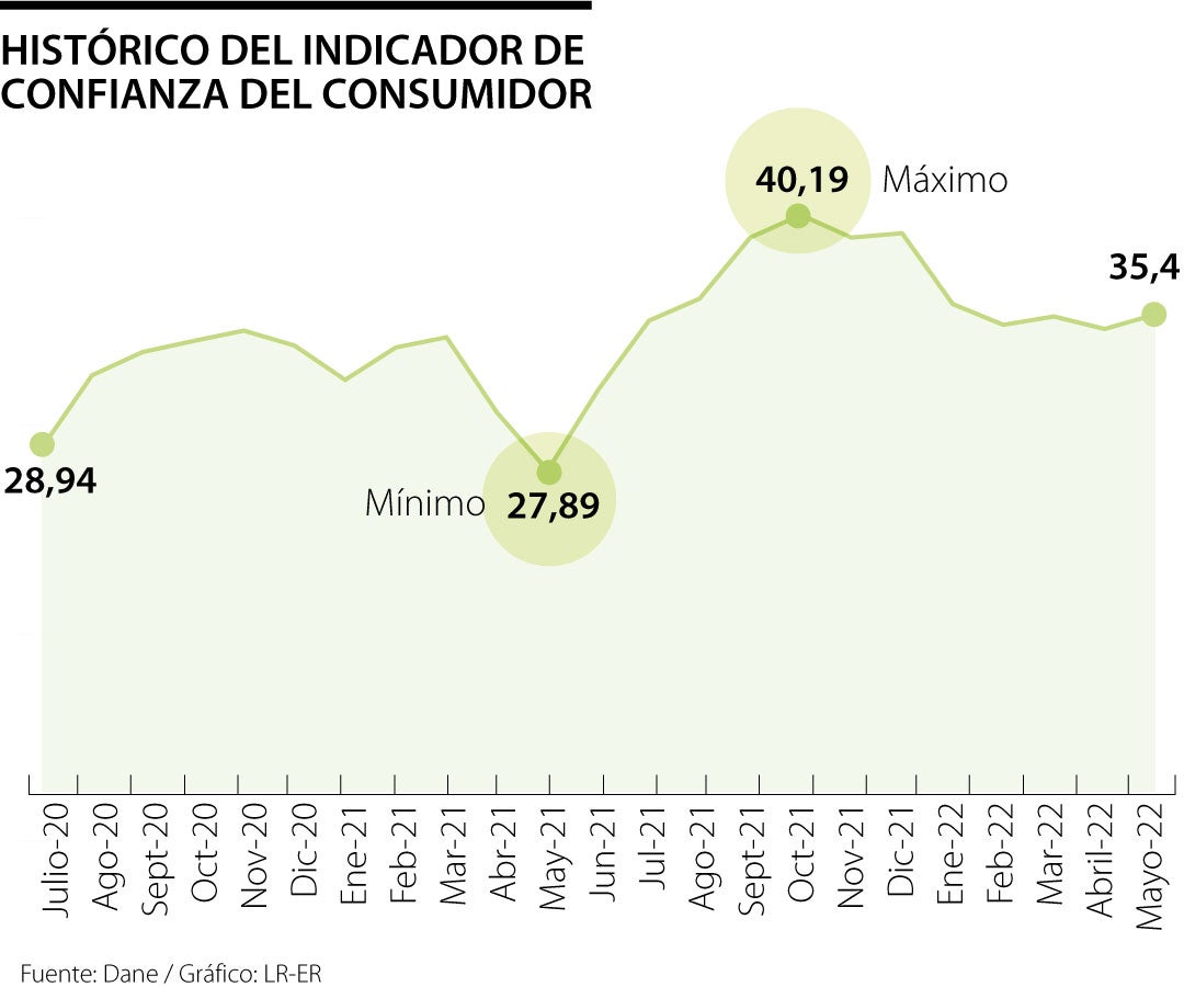 El Departamento Administrativo Nacional de Estadística (Dane) reveló que el Indicador de Confianza del Consumidor (ICC) aumentó 0,7 puntos en el mes de mayo, si se tiene en cuenta que en abril estaba en 34,7 puntos y en el quinto mes del año se ubicó en 35,4 puntos. Juan Daniel Oviedo, director de la entidad, aseguró que aún así “seguimos con un componente atípicamente por debajo de los niveles de confianza que observábamos a finales del año pasado”.