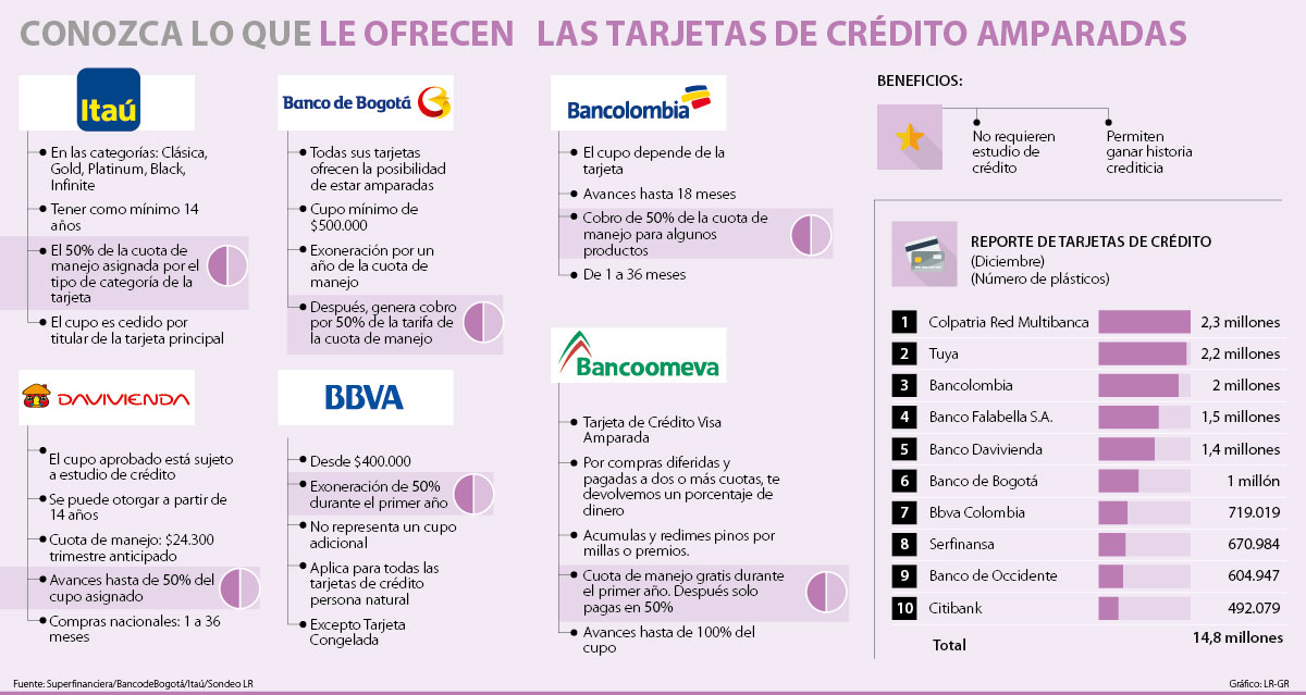 Banco de Bogotá le ofrece tarjetas con un cupo mínimo de $500.000. En este tipo de plásticos ofrecen el beneficio de la exoneración de la cuota de manejo por un año y después de cumplido este tiempo solo se genera cobro por 50% de la tarifa de la cuota de manejo según el producto asignado. “Los beneficios que reciben los amparados son los mismos de un titular de la tarjeta otorgada, participan dentro del plan de fidelización de manera independiente y pueden disfrutar de todas las ventajas de seguros, asistencias, acceso a preventas de los mejores conciertos que patrocina Grupo Aval, descuentos con aliados, entre otras”, explicó Ortiz.