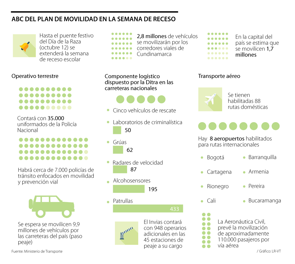 De otro lado, la Ditra dispuso un componente logístico que se desplegará en todas las carreteras nacionales con 62 grúas y 433 patrullas vigilando la movilidad. Se instalarán 279 puestos de prevención, con el fin de garantizar que los viajeros cumplan con las medidas estipuladas por el Ministerio de Salud y, además, se contará con 50 laboratorios de criminalística, 195 alcohosensores y 87 radares de velocidad.