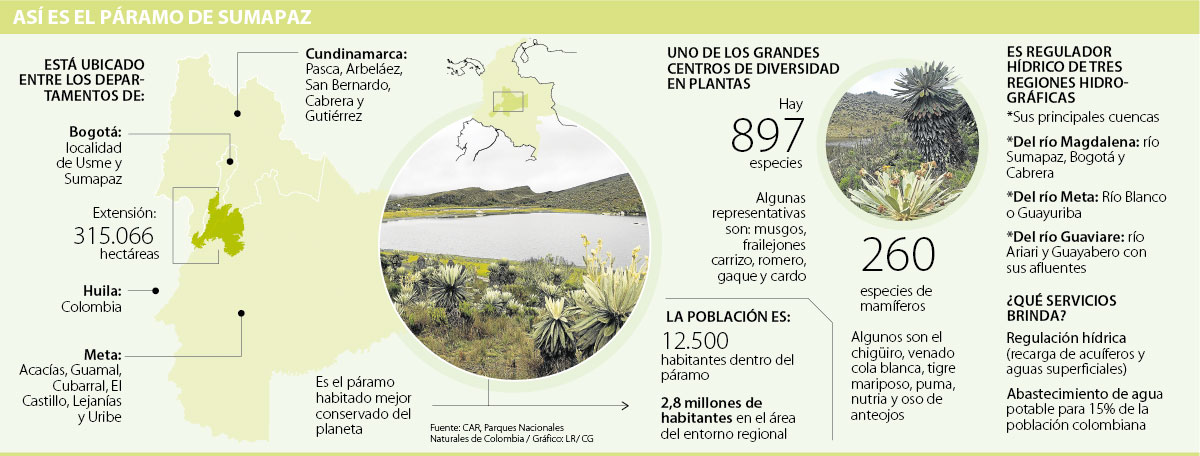 De acuerdo con Parques Nacionales Naturales, el páramo tiene una extensión de 315.066 hectáreas y está ubicado en cinco municipios de Cundinamarca, seis de Meta, uno de Huila y en las localidades de Usme y Sumapaz de Bogotá.