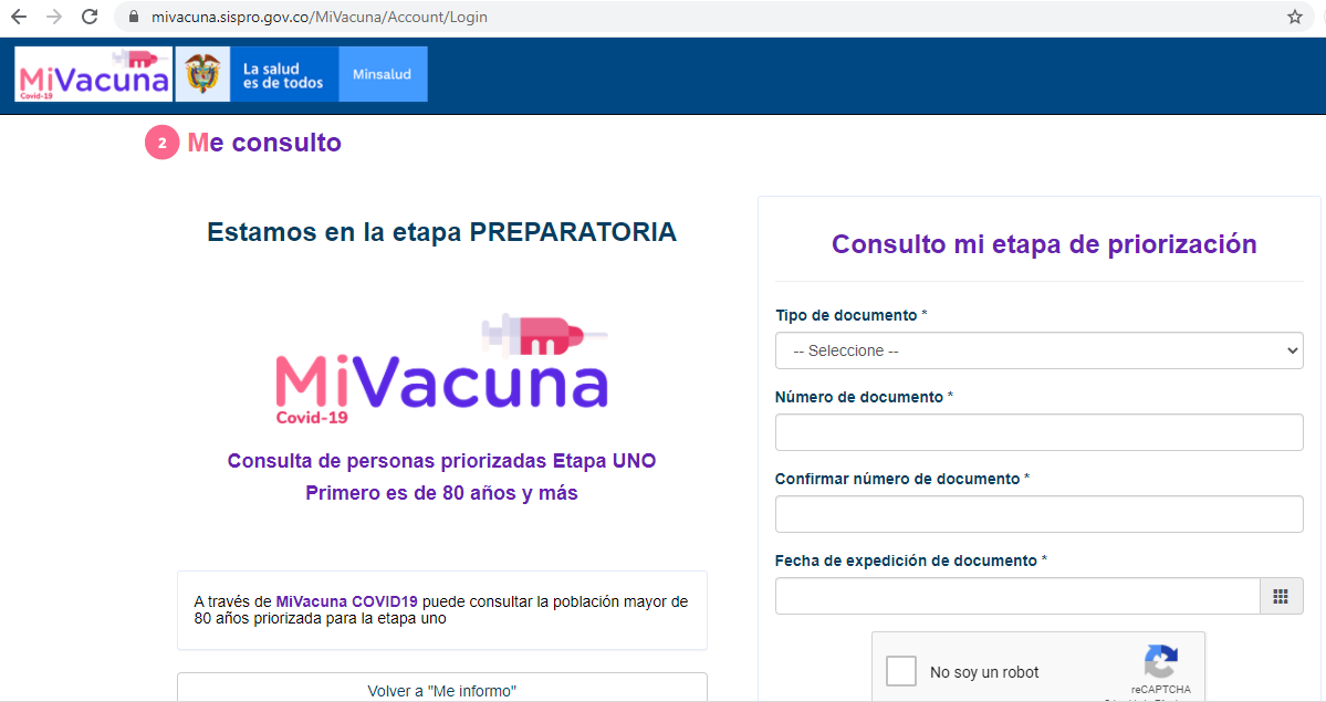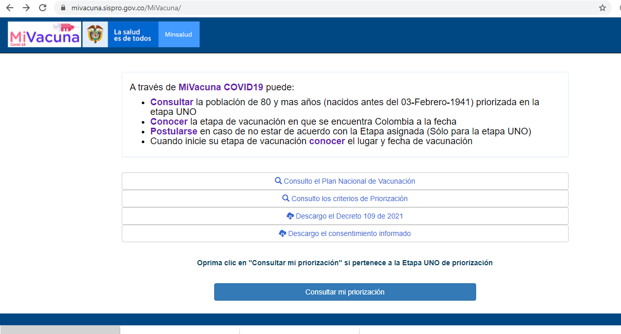 atención de la pandemia y los adultos de 80 años. Para conocer en qué etapa de vacunación se encuentran las personas, el Ministerio de Salud lanzó el portal Mi Vacuna, en el que los colombianos se pueden informar, consultar y postularse en lo referente a la vacunación.