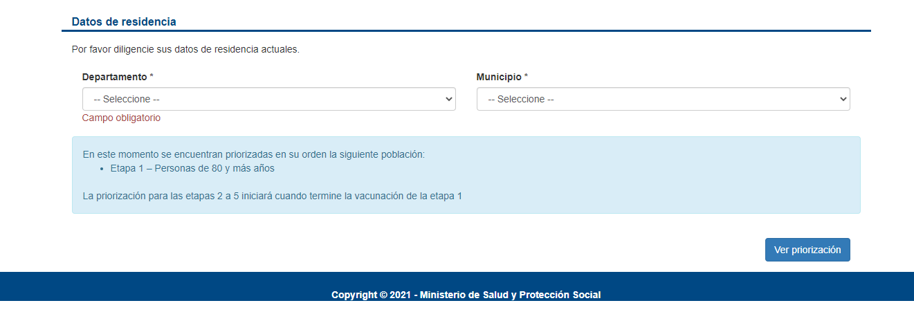 En el paso tres tiene que rellenar los datos de residencia. La plataforma solicita departamento y municipio. Luego tiene que dar clic en el botón Ver priorización.