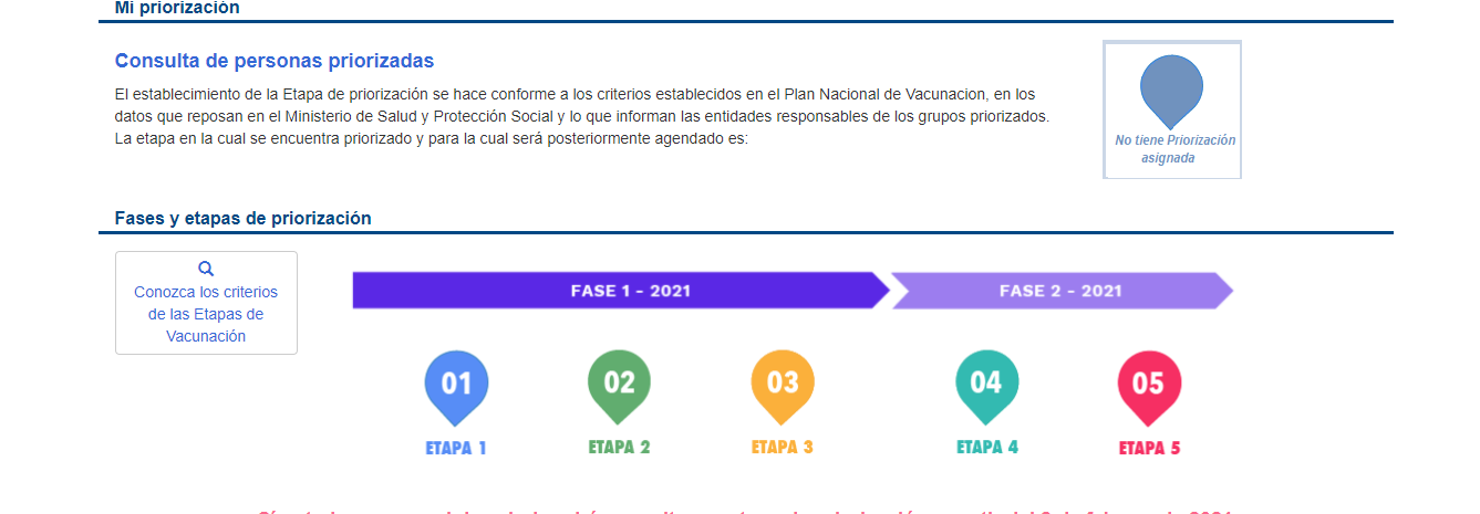 Aparecerá en pantalla las etapas del proceso de vacunación. Como hasta la fecha solo está disponible la información de la población mayor de 80 años, podrá salir que aún no está en un grupo priorizado. Si usted pertenece al personal de salud, podrá consultar su etapa de priorización a partir del ocho de febrero.