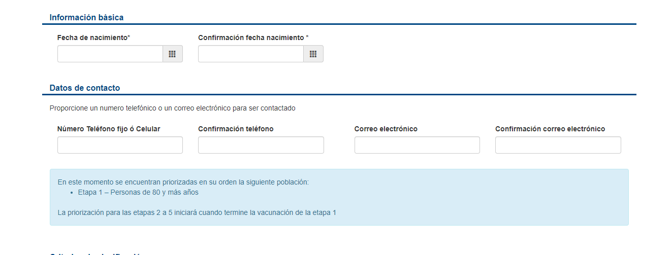 Al dar clic, la plataforma del solicitará fecha de nacimiento y confirmación de nacimiento. Además, datos de contacto como: número telefónico (fijo o celular), confirmación teléfono, correo electrónico y confirmación correo electrónico.