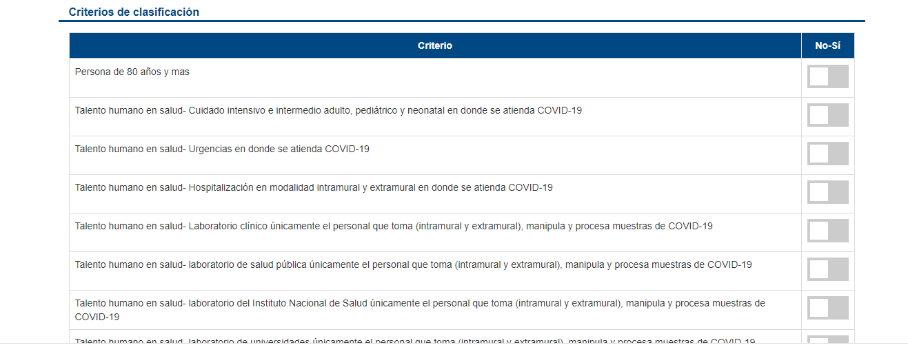 Luego, también le pedirán rellenar unas casillas que evalúan los criterios de vacunación . Deberá leer atentamente y responder sí o no a los criterios.