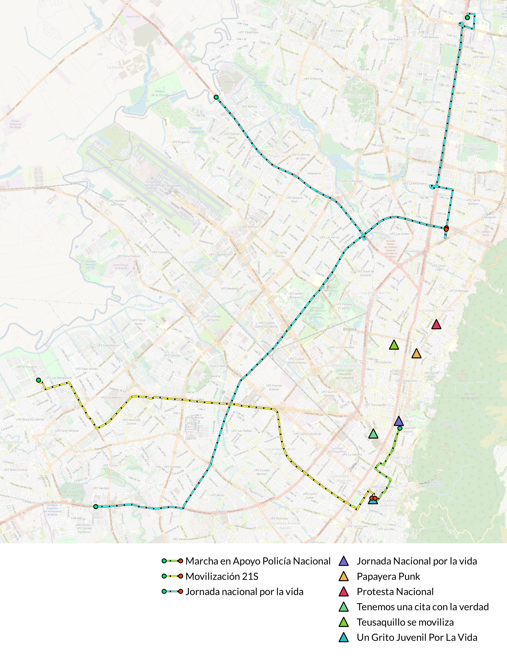 La 'Movilización 21S', también iniciará a las 9 a.m. desde la Universidad Distrital sede Porvenir por Banderas hacía el Centro al mismo lugar y la tercera movilización, la 'Marcha en apoyo a la institución de la Policía Nacional de Colombia', iniciará a las 10 a.m. desde el Parque Nacional e irá hasta la Plaza de Bolívar por la Carrera 7.