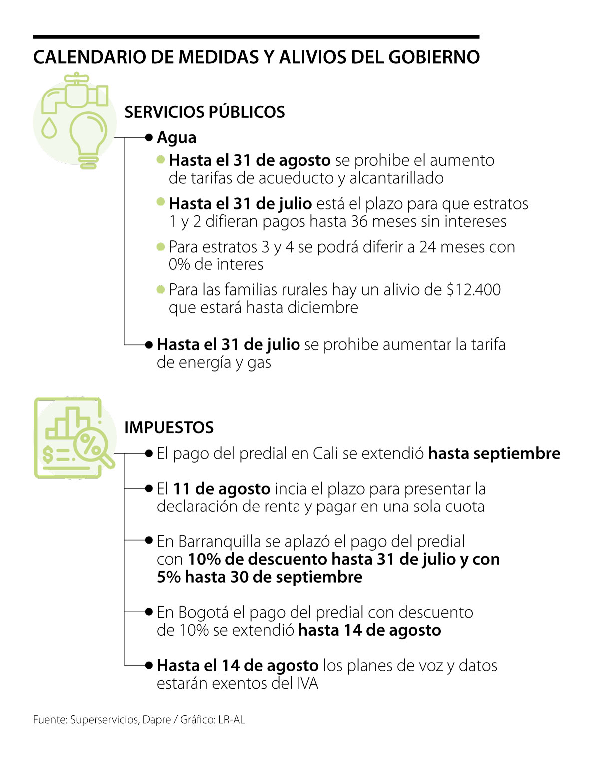 Una vez se entró en cuarentena estricta en el país, el Gobierno Nacional tomó medidas rápidas para mitigar el impacto negativo que traería en los bolsillos de los colombianos. Una de estas fue la reconexión de los servicios públicos a todos los hogares, así como el congelamiento de los incrementos de tarifa de servicios y el diferimiento de los pagos, más la exención en algunos, y la ampliación de cronogramas de algunos impuestos.