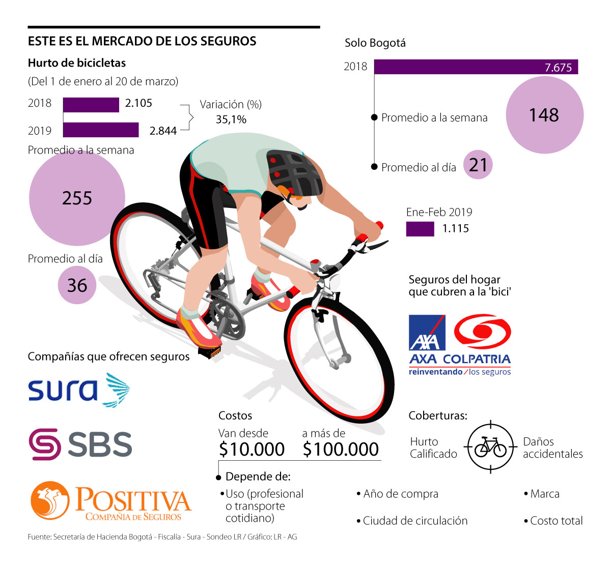 A diario se roban en promedio en Bogotá, la que es considerada como la capital mundial de la bicicleta por tener más de 500 kilómetros de ciclorrutas, unas 21 bicis. En total, según reportó la Secretaría de Seguridad de la capital, el año pasado fueron víctimas de este flagelo unos 7.675 biciusarios y, a pesar de que en los dos primeros meses del año se redujo 5% el número de denuncias a 1.115, han sido varias las personas que han perdido la vida por culpa de estos hechos. Además, a nivel nacional, la Fiscalía reportó que el hurto ha crecido a ritmos de 35% en lo que va de año.