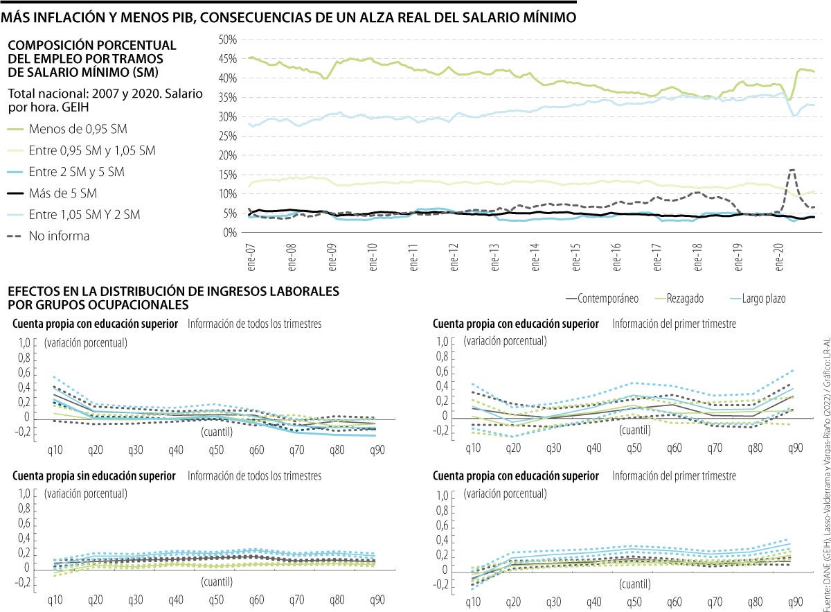 “Algo cierto es que, según la evidencia empírica que se dispone hasta ahora, un aumento real en el SM solo tiene efectos nocivos en el consumo, en el bienestar de los trabajadores y en las finanzas públicas. Y en últimas, los más perjudicados son los hogares de ingresos bajos”, agregó Arango.