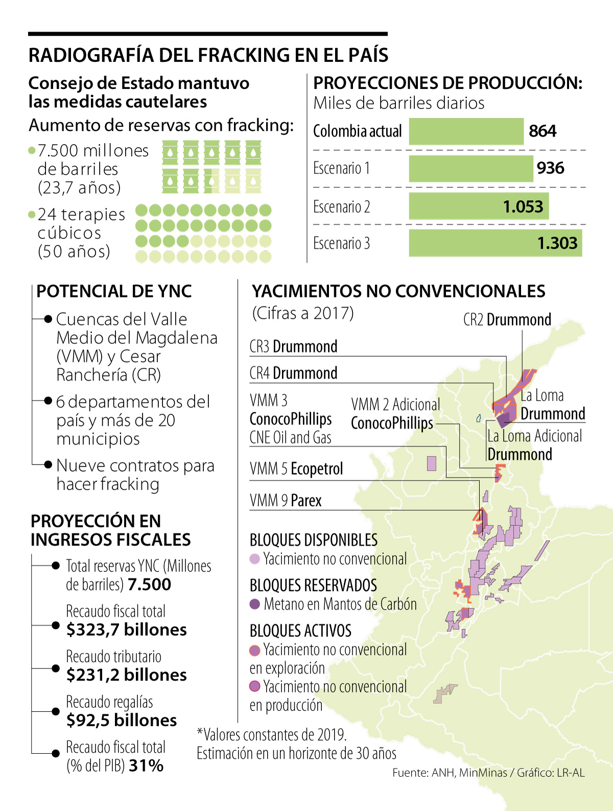 La no autorización para iniciar los primeros proyectos pilotos de investigación retrasará, igualmente, el desarrollo que se preveía en el sector. Esto debido a que con esta tecnología se tiene estimado que las reservas de petróleo aumenten 23,7 años, mientras que las de gas hasta 50 años. A esto se suma que el país ya estaba haciendo cuentas con la implementación de esta tecnología. O así quedó estipulado en el Marco Fiscal de Mediano Plazo, en el que se reveló que la explotación y producción de Yacimientos No Convencionales dejaría regalías por $92 billones, e ingresos fiscales por $324 billones, en un horizonte de 30 años.