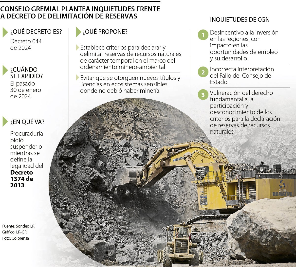 El Consejo Gremial Nacional, CGN, expresó inquietudes frente al Decreto 044 de 2024, expedido a finales de enero, y mediante el cual “se establecen criterios para declarar y delimitar reservas de recursos naturales de carácter temporal en el marco del ordenamiento minero-ambiental”.