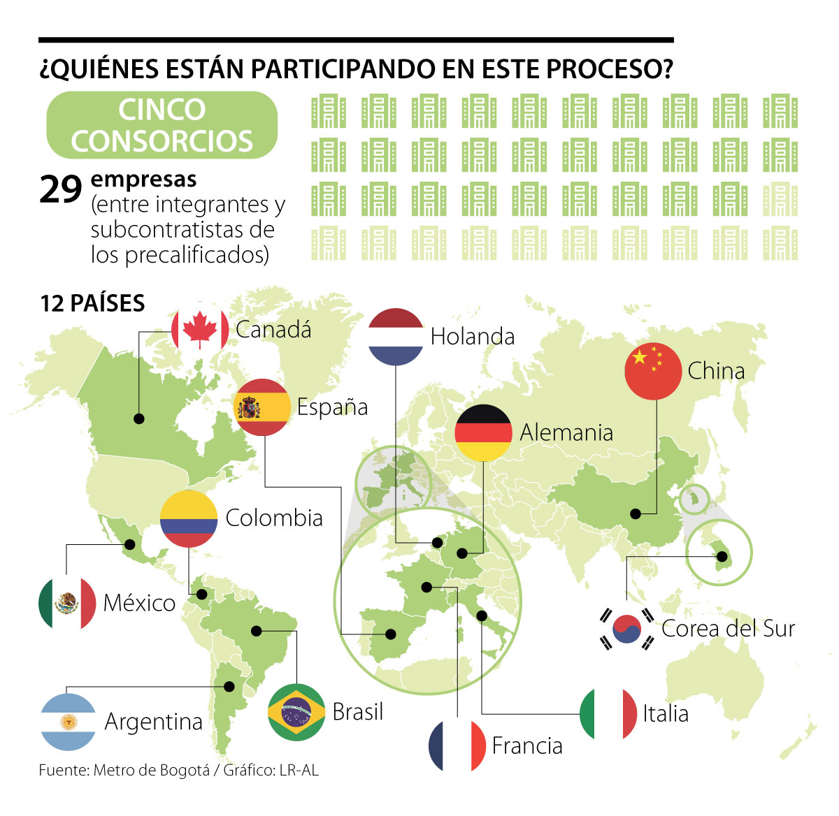 De otro lado, el Consorcio Sunrise lo constituyen Acciona Construcción (España), Impregilo International Infrastructures (Holanda) y las italianas Hitachi Rail STS y Hitachi Rail S.p.A. Por su parte, el de Apca TransMimetro está integrado por China Harbour Engineering Company Limited y Xi’An Metro Company Limited, y el de Unión Metro Capital por las españolas Sacyr Concesiones y Construcciones y Auxiliar de Ferrocarriles CAF, la coreana Hyundai Engineering & Construction Co. Ltd. y la francesa Stoa.
