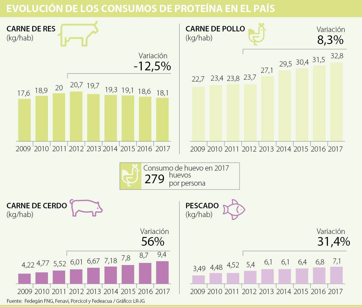 El consumo de proteínas en Colombia ha tenido un crecimiento constante desde hace al menos cinco años debido a una mayor variedad en la alimentación, dicen los gremios. Así, en 2017, cada colombiano consumió 67,4 kilos de carne, contra los 53 kilos que comió en 2012.