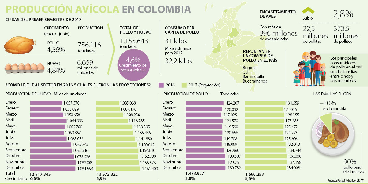 Con un crecimiento de 4,6% en la producción avícola durante el primer semestre y una caída en los precios al consumidor, es posible que a final del año los colombianos hayan consumido 32,2 kilos per cápita de carne de pollo y 272 huevos, que son las cifras proyectadas por la agremiación para el cierre de 2017.