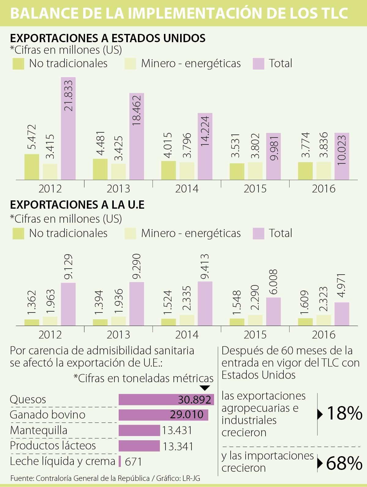 Uno de los sectores que más relegó las exportaciones, sobre todo por la ausencia de admisibilidad sanitaria, fue el agropecuario y agroindustrial. Según el informe de los resultados de la auditoría, desde que entró en vigencia el TLC con Estados Unidos se dejaron de exportar más de 30.800 toneladas métricas de quesos, 29.010 de carne de ganado bovino y 13.431 de productos lácteos procesados y mantequilla, respectivamente.