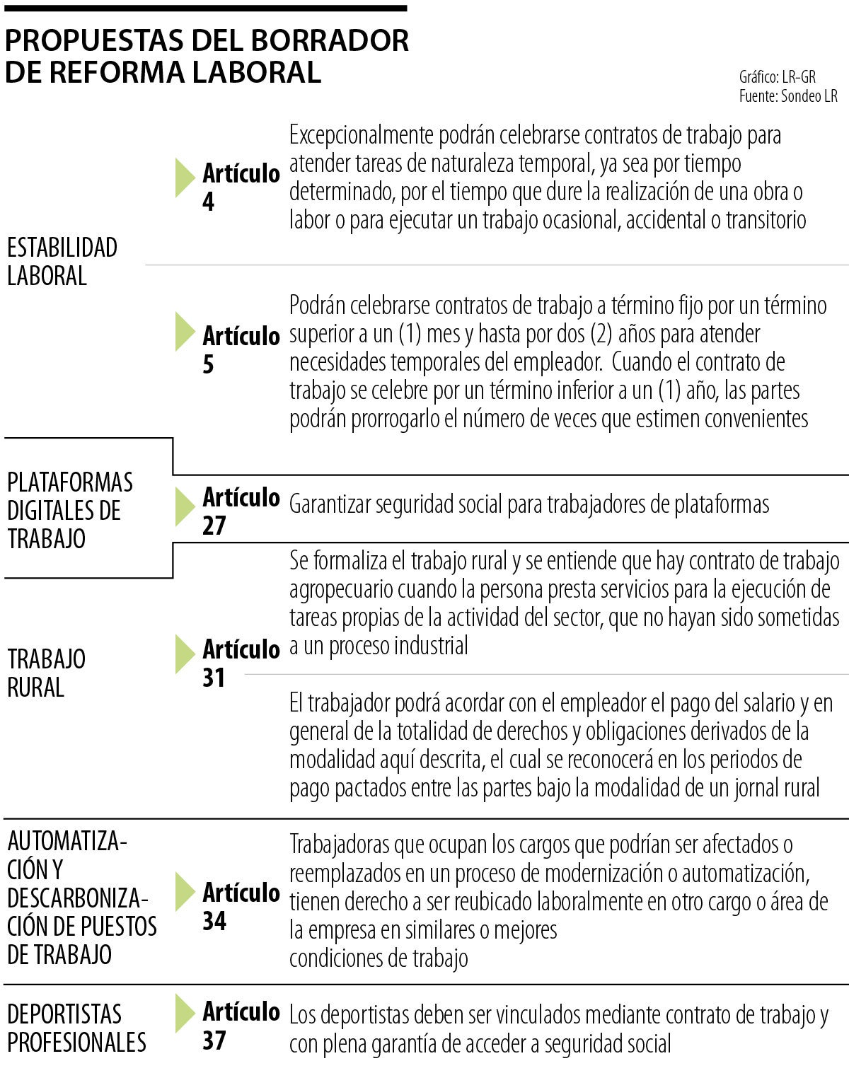 Otro de los planteamientos es la regulación de trabajadores de plataformas digitales, quienes ahora accederán a seguridad social. También se mantendría la reducción de la jornada de 48 a 42 horas semanales y la obligación de vincular por contrato de trabajo a todos los deportistas.
