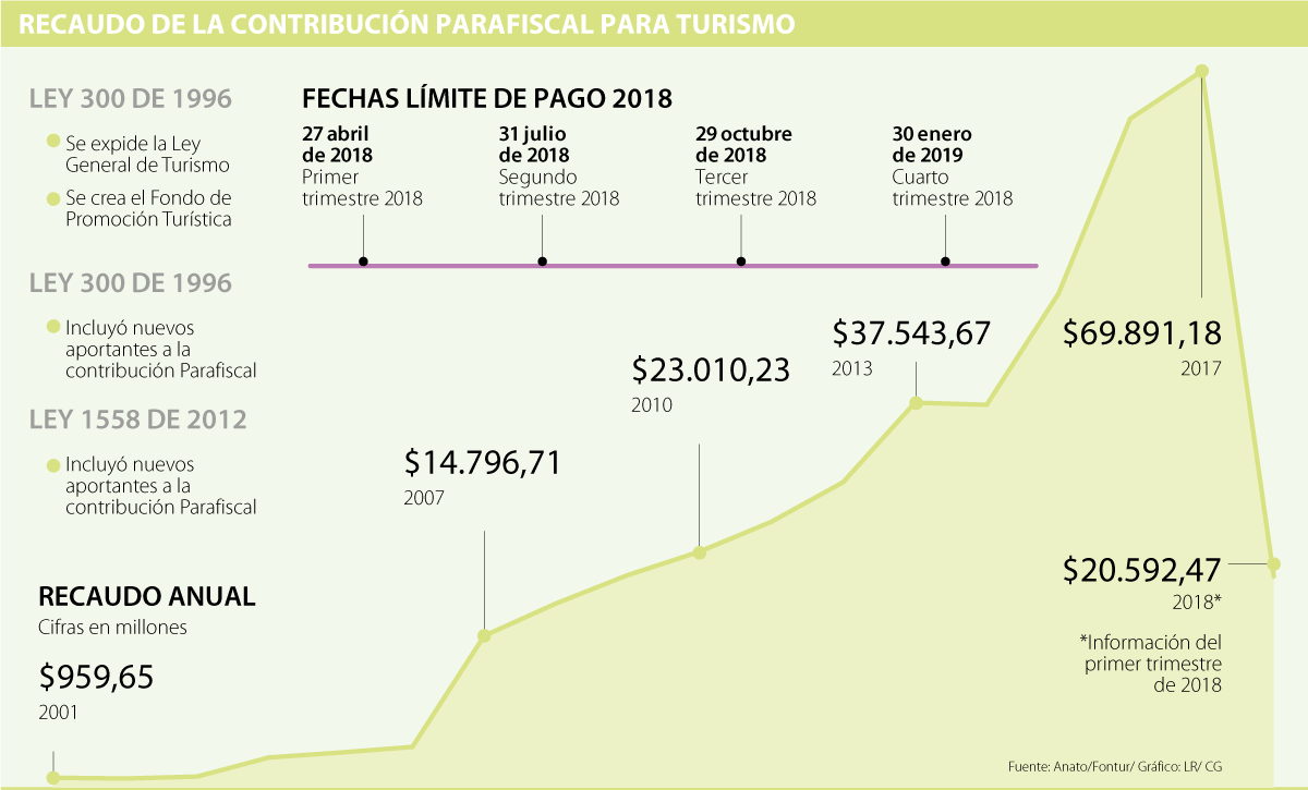Hoy se vence el plazo para que los operadores y prestadores de servicios turísticos cumplan con el pago correspondiente al segundo trimestre de la Contribución Parafiscal para la Promoción del Turismo, un tributo con el que el Fondo Nacional de Turismo (Fontur) ha recaudado $424.178 millones desde 2001 para la ejecución de proyectos de infraestructura, competitividad, promoción y mercadeo con el fin de incrementar el turismo interno y receptivo.