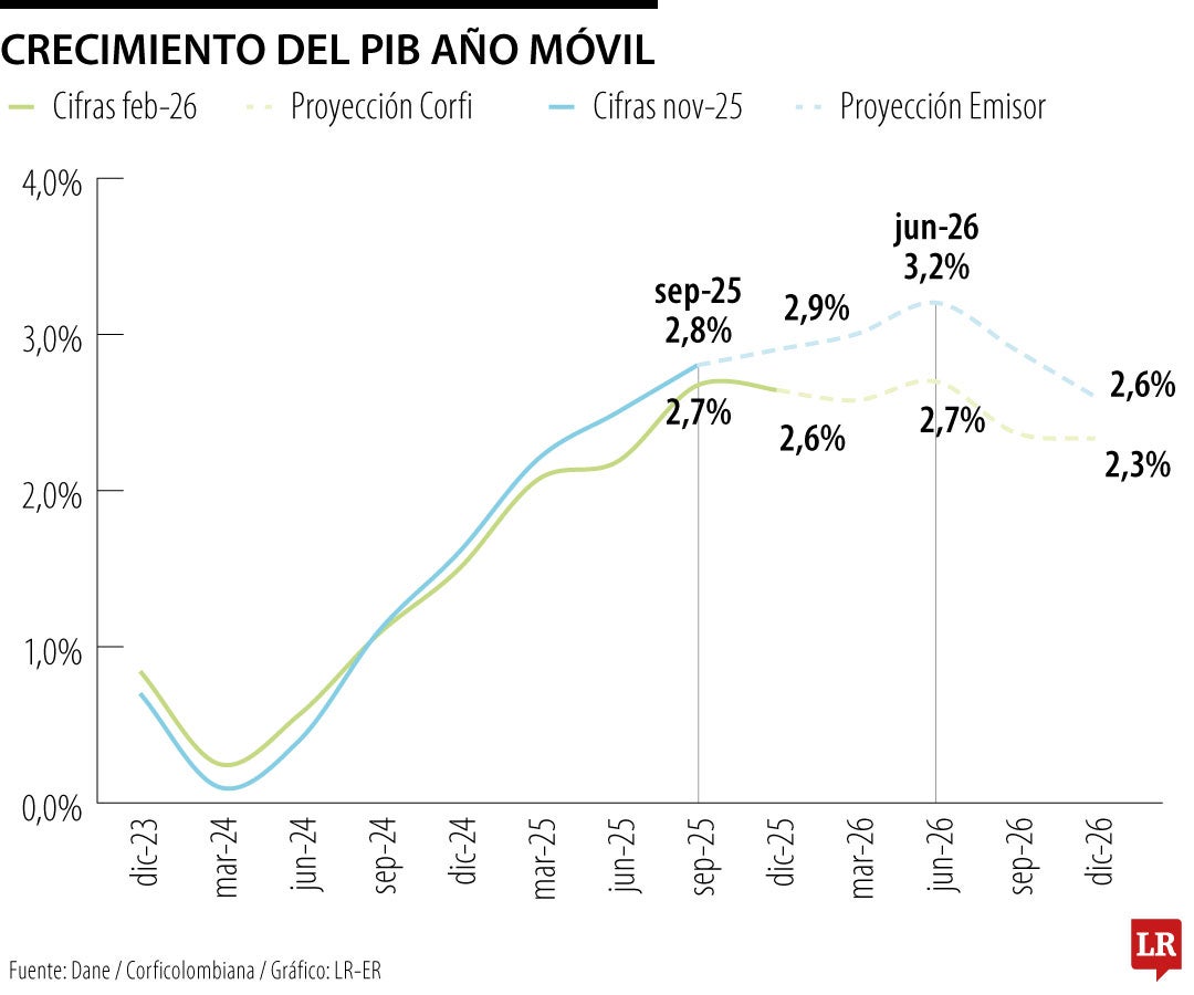 Frente a la lectura del cierre de 2025 y lo que va de este año, Corficolombiana indicó que la economía del país viene registrando señales de debilitamiento desde finales del año pasado, las cuales se ven reflejadas en los datos más recientes del PIB y del Indicador de Seguimiento a la Economía, ISE: el primero creció apenas 2,6% en el cuarto trimestre y el segundo aumentó solo 1,5% en enero, luego de haber acumulado cuatro meses seguidos de desaceleración.