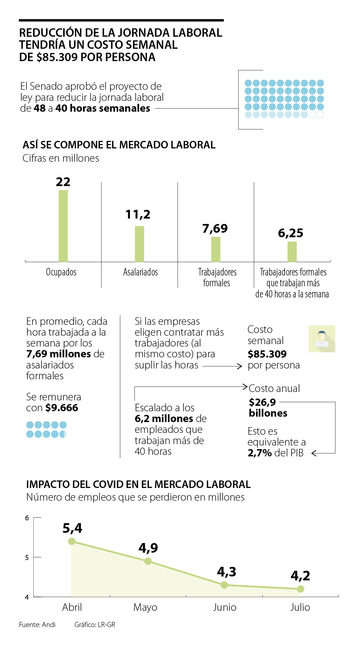 En un concepto enviado por el gremio se calculó que, en promedio, para cubrir las ocho horas no trabajadas en la semana, las empresas tendrían que cargar con un costo semanal de $85.309 por persona.