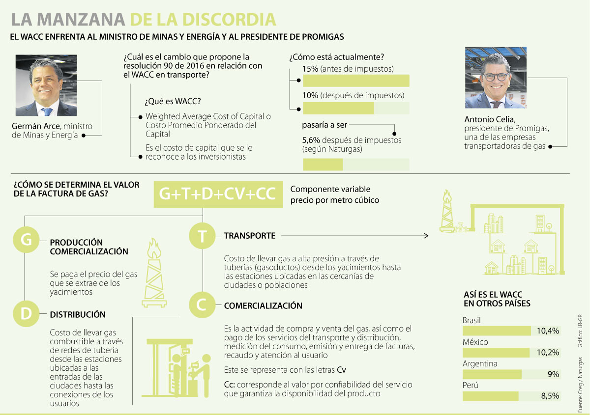 ¿Cuál es la razón de este pleito? Orlando Cabrales, presidente de la Asociación Colombiana de Gas Natural (Naturgas), de la que hacen parte empresas como Promigas, dijo que en la nueva metodología para la remuneración del transporte de gas hay un tema que preocupa al gremio, y es el wacc, es decir, el costo de capital que se reconoce a los inversionistas.