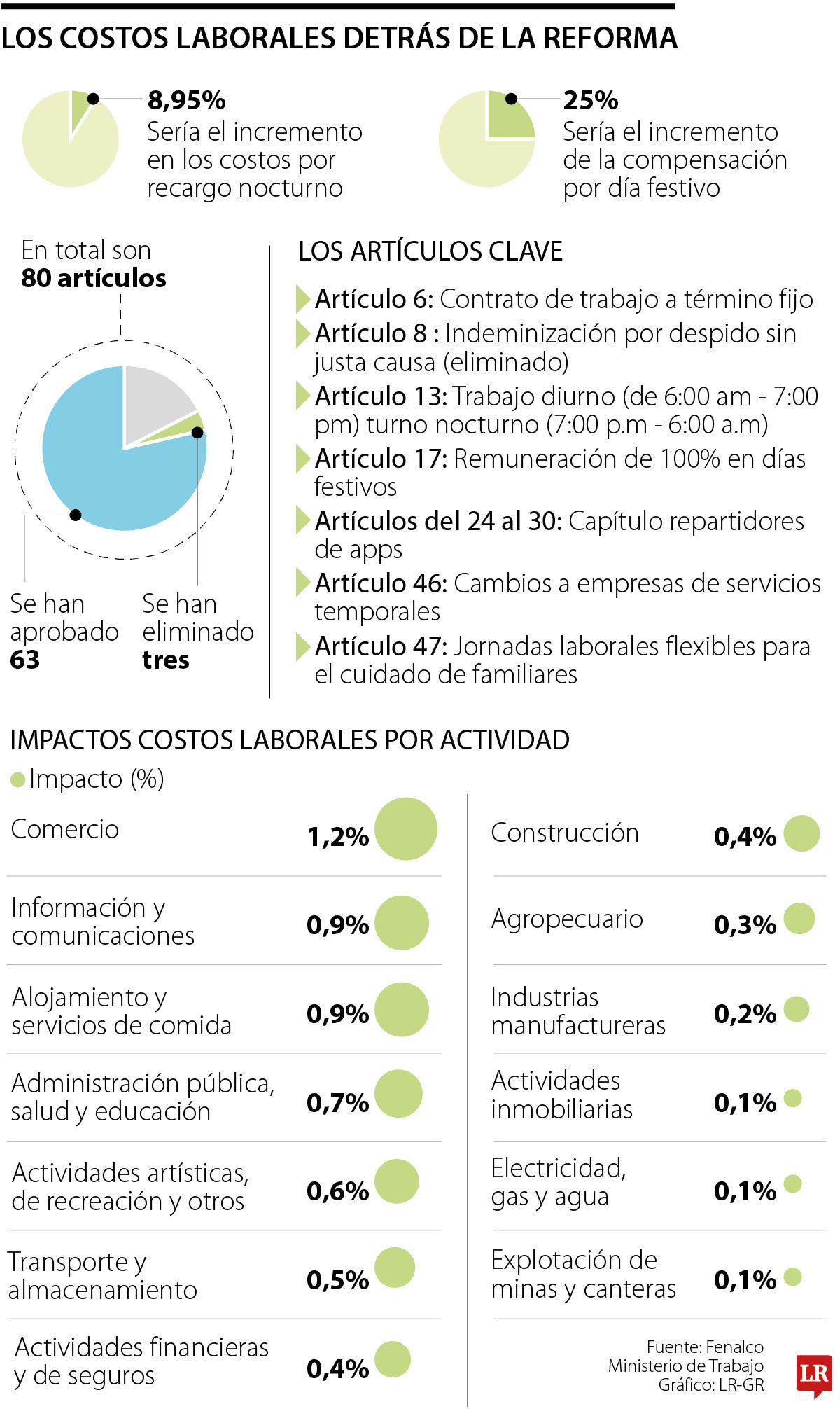 “El proyecto de la reforma laboral tendrá un mayor impacto en el comercio, las tiendas de barrio, panaderías, cafeterías, restaurantes, hoteles, empresas de transporte, logística y vigilancia, entre muchas actividades de la economía”, puntualizó el informe elaborado por el gremio de los comerciantes.