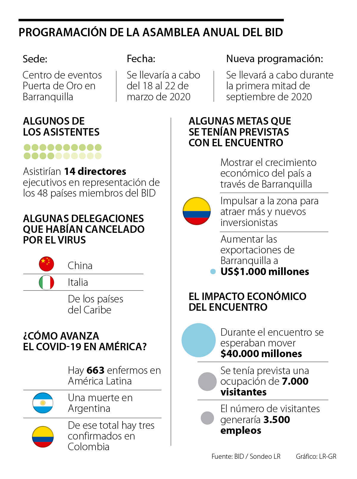 La decisión de aplazar este encuentro económico, que se tenía programado para el 18 y 22 de marzo, se dio con base al “contexto de las extraordinarias circunstancias de salud pública generadas por la respuesta global al coronavirus (Covid-19), y por las recomendaciones difundidas por autoridades como la Organización Mundial de la Salud, los Centers for Disease Control (CDC) de EE.UU., y la Organización Panamericana de la Salud (Paho)”, informó el BID.