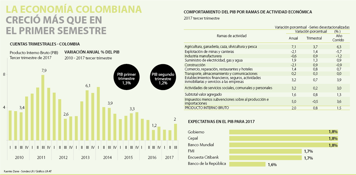 Como se mencionó, la economía colombiana creció 2% en el tercer trimestre. Los sectores que lograron impulsar al PIB para este periodo fueron el agro con una variación de 7,1%, y los establecimientos financieros y los servicios sociales, estos dos últimos con una cifra de 3,2%, según el Dane.