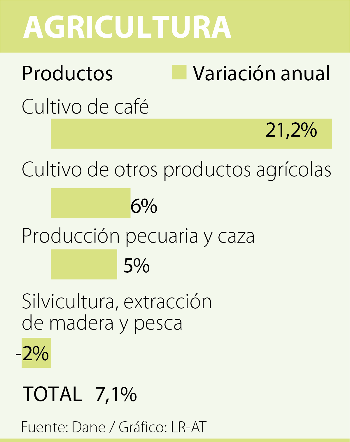 En el tercer trimestre de 2017, el agro varió 7,1% frente a 2016. El comportamiento obedece al crecimiento de cultivo de café en 21,2%, cultivo de otros productos agrícolas en 6% y animales vivos y otros productos animales en 5%. Juan Guillermo Zuluaga, ministro de Agricultura, dijo que “el campo colombiano sigue liderando el crecimiento económico del país”.