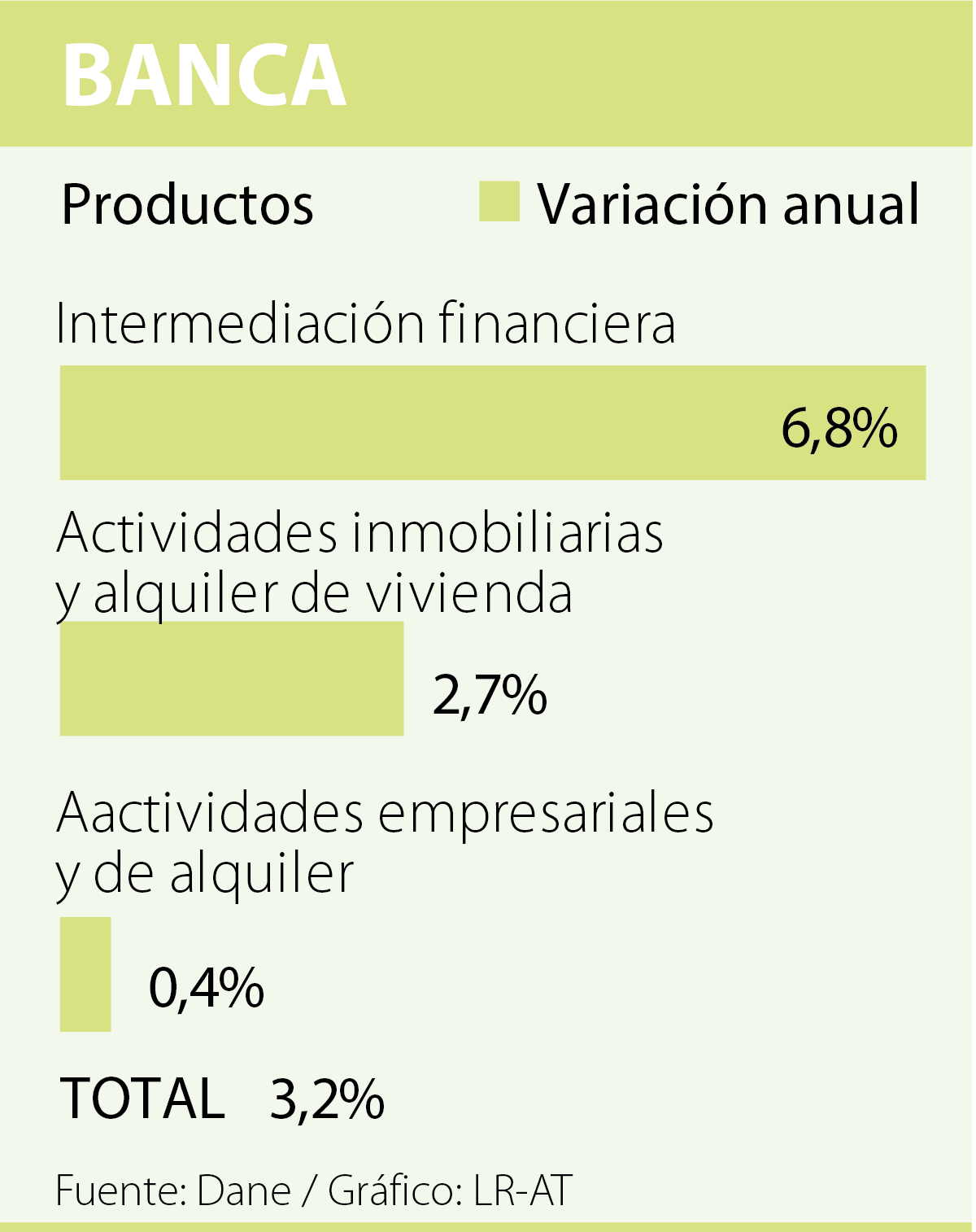 Los establecimientos financieros y seguros se mantienen como el segundo sector jalonador de la economía. De acuerdo con el Dane, esta rama creció 3,2%, cifra que es explicada por el aumento de los servicios de intermediación financiera en 6,8%, actividades inmobiliarias y alquiler de vivienda en 2,7%, y las actividades empresariales y de alquiler en 0,4%.