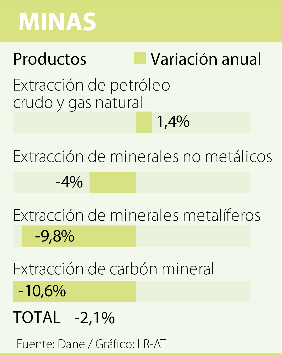 Las malas noticias de la economía nacional están por el lado de la explotación de minas y canteras (-2,1%). Este comportamiento se debe a la disminución de carbón mineral en 10,6%, extracción de minerales metalíferos en 9,8% y la extracción de minerales no metálicos en 4%. A pesar de esto el sector de petróleo registró un balance positivo con alza de 1,4%.
