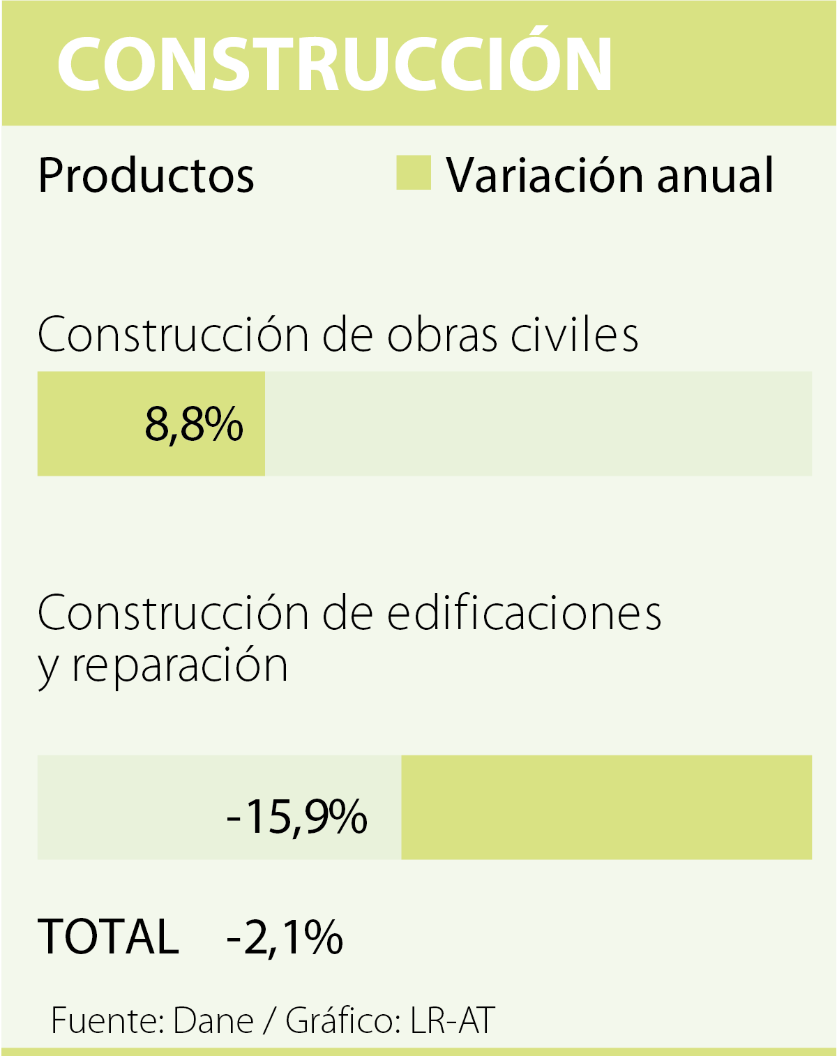 Las ramas de actividad que siguen de capa caída son la construcción (-2,1%); la explotación de minas y canteras (-2,1%); y la industria manufacturera (-0,6%), las cuales tuvieron decrecimientos. Otras ramas como suministro de electricidad, comercio y transporte tuvieron variaciones de 1,9%, 1,4% y 0,2% respectivamente.