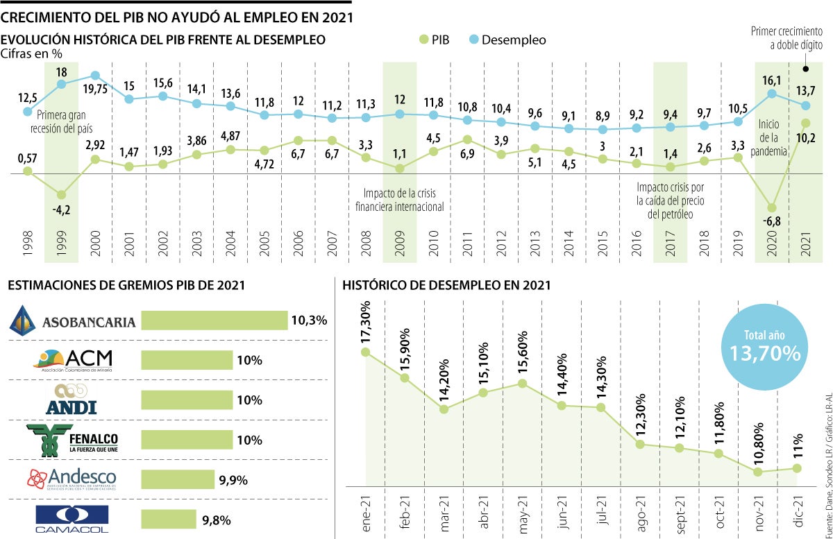 Si bien este dato es una recuperación de lo perdido durante 2020, esto aún no se refleja en otros aspectos como la recuperación del empleo. Este cerró 2021 en 13,7% de acuerdo con cifras del Dane. Es decir, para llegar a niveles de prepandemia, hace falta recuperar 1,2 millones de puestos, cifra similar a la recuperada el año anterior.